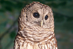 The vocal barred owl is well known for its distinctive call, which sounds like the bird calling “Who cooks for you … who cooks for you all?” They often swallow their prey whole and, after digesting the softer parts, the parts that cannot be digested form into a pellet that is then coughed up. Scientists collect and dissect these pellets and determine what animals are in a habitat based on what the owls are eating.